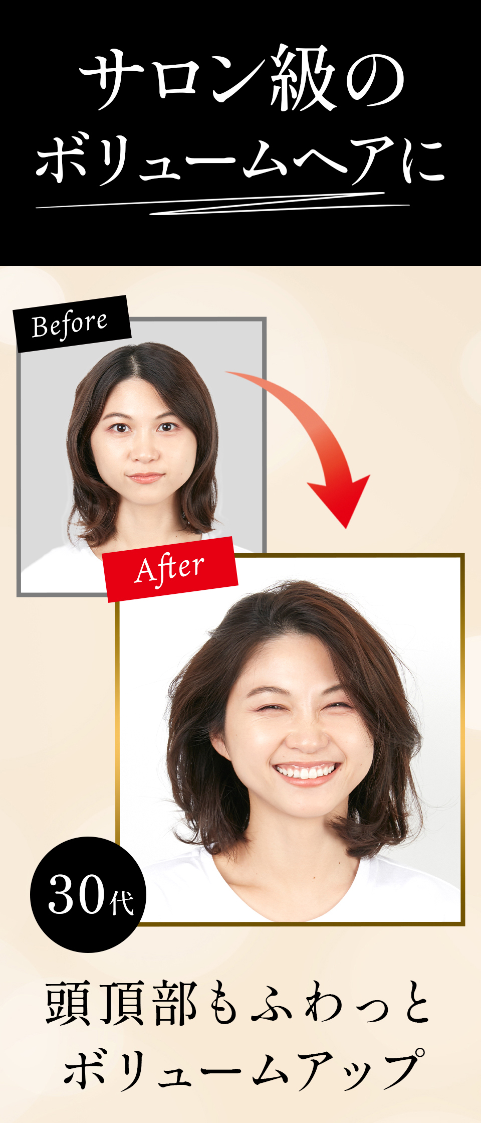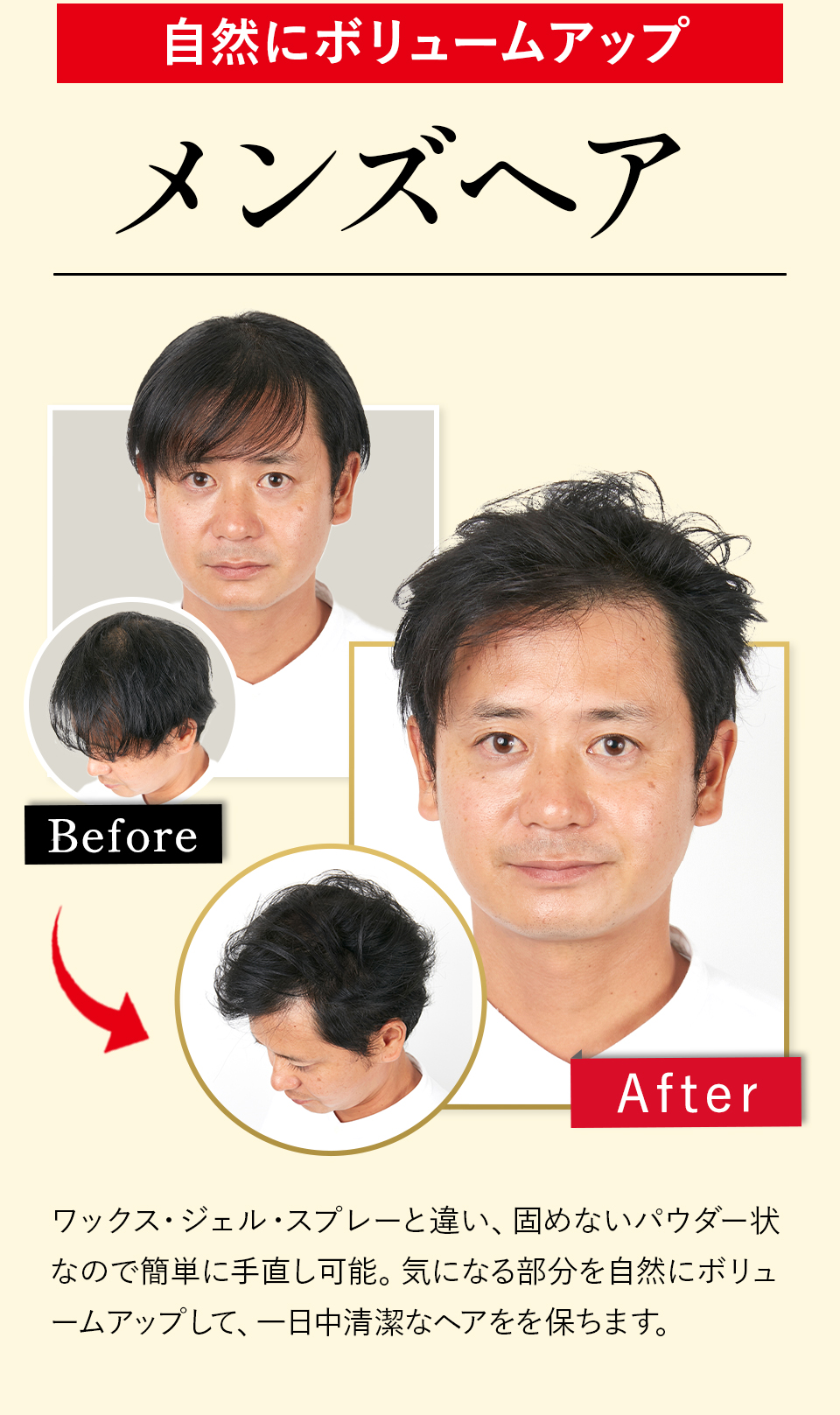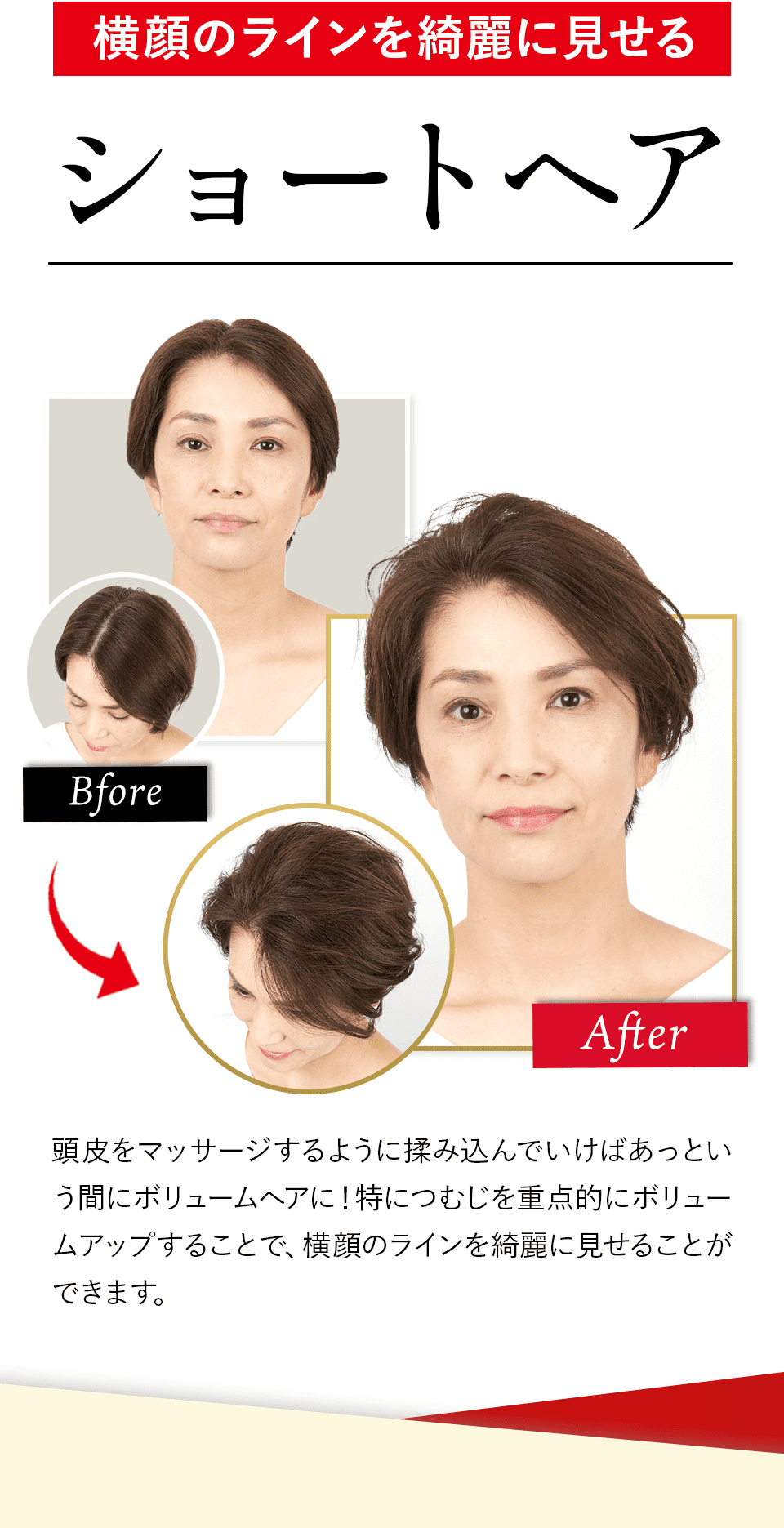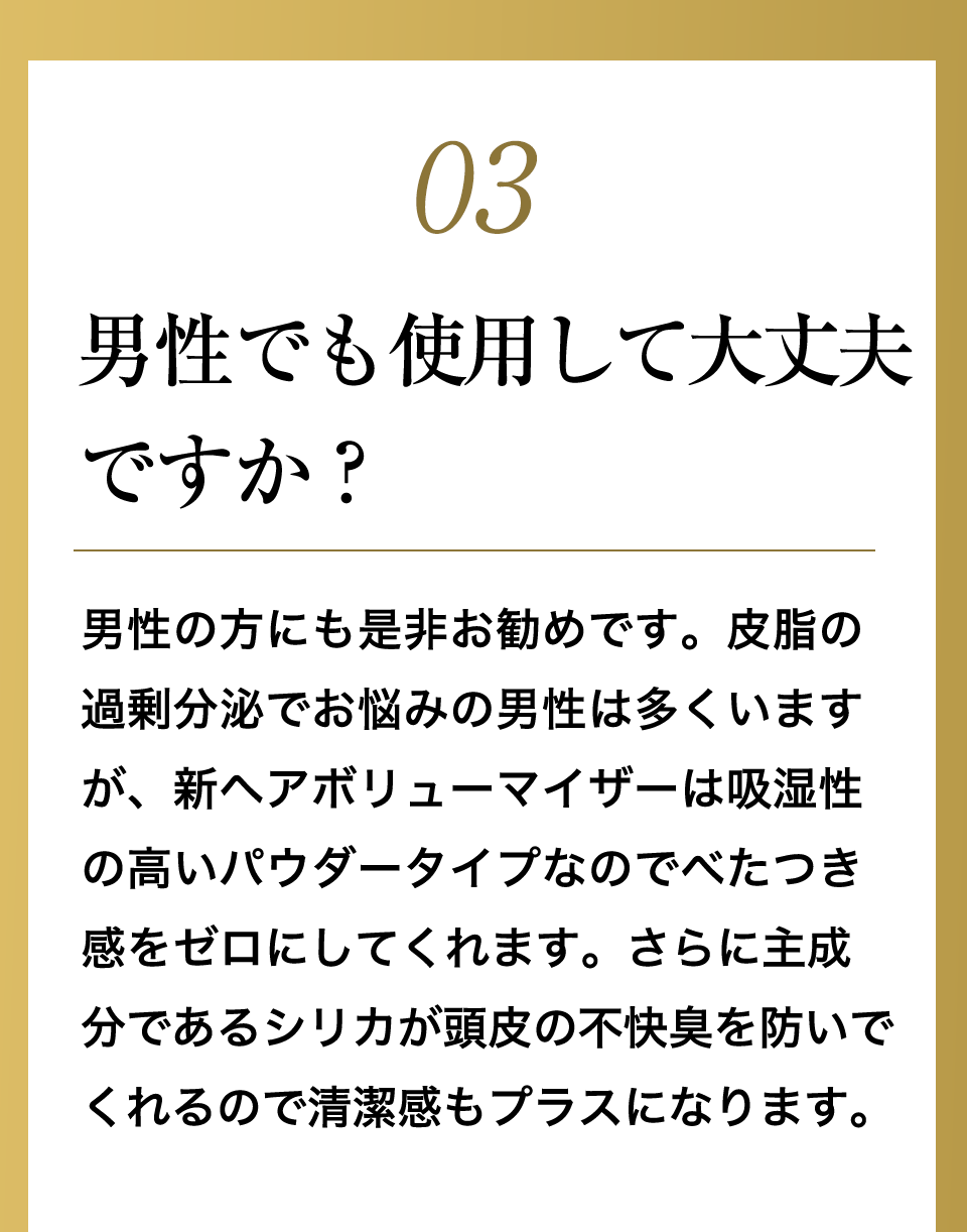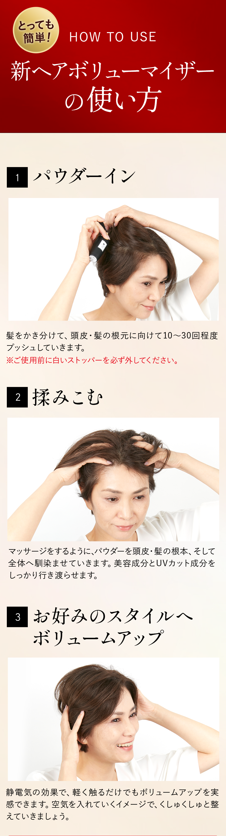 髪をかき分けて頭皮に全体頭皮にプッシュし、マッサージするようにもみ込むだけで、簡単にお好みのスタイルへボリュームアップできます。