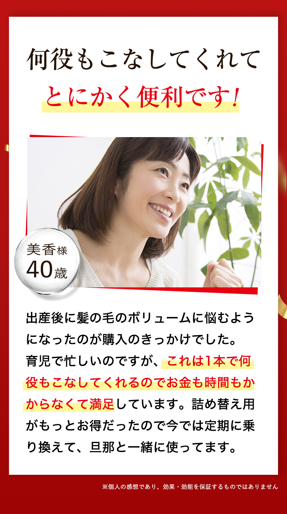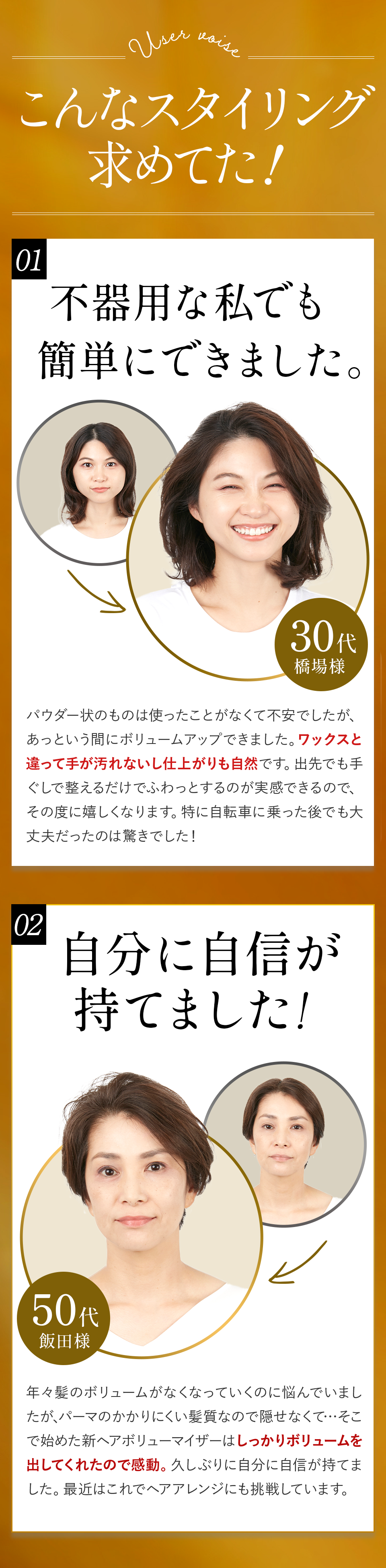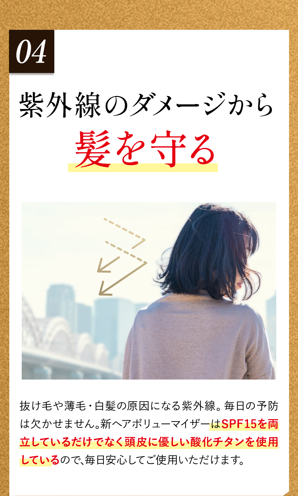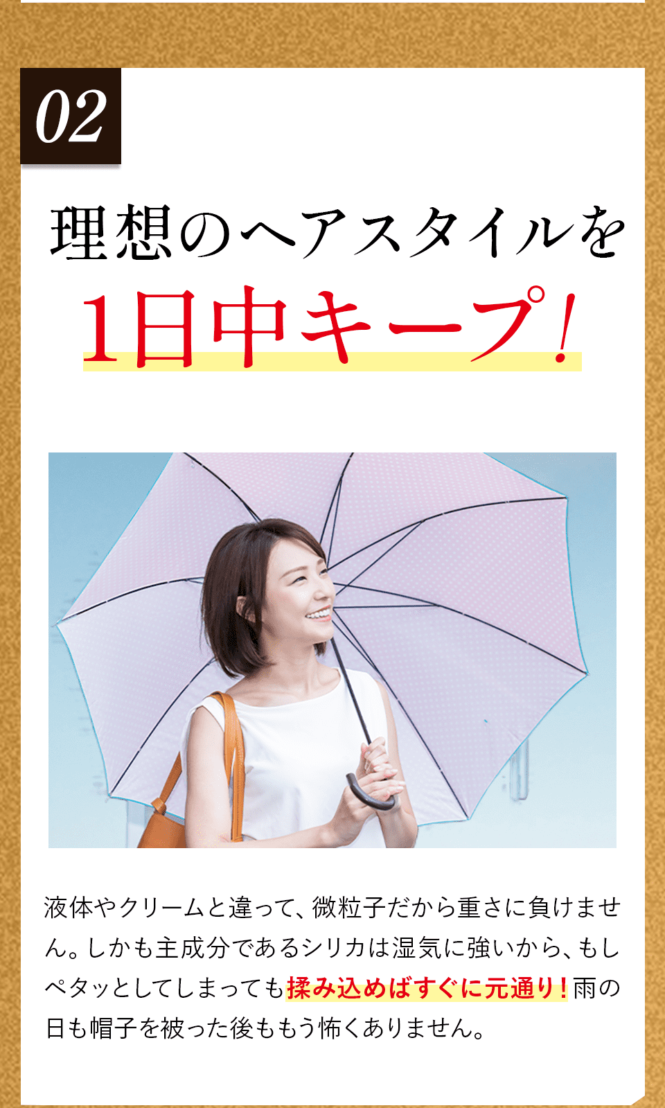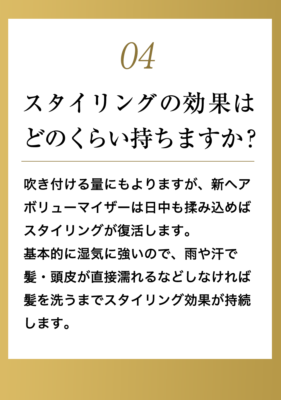 髪をかき分けて頭皮に全体頭皮にプッシュし、マッサージするようにもみ込むだけで、簡単にお好みのスタイルへボリュームアップできます。