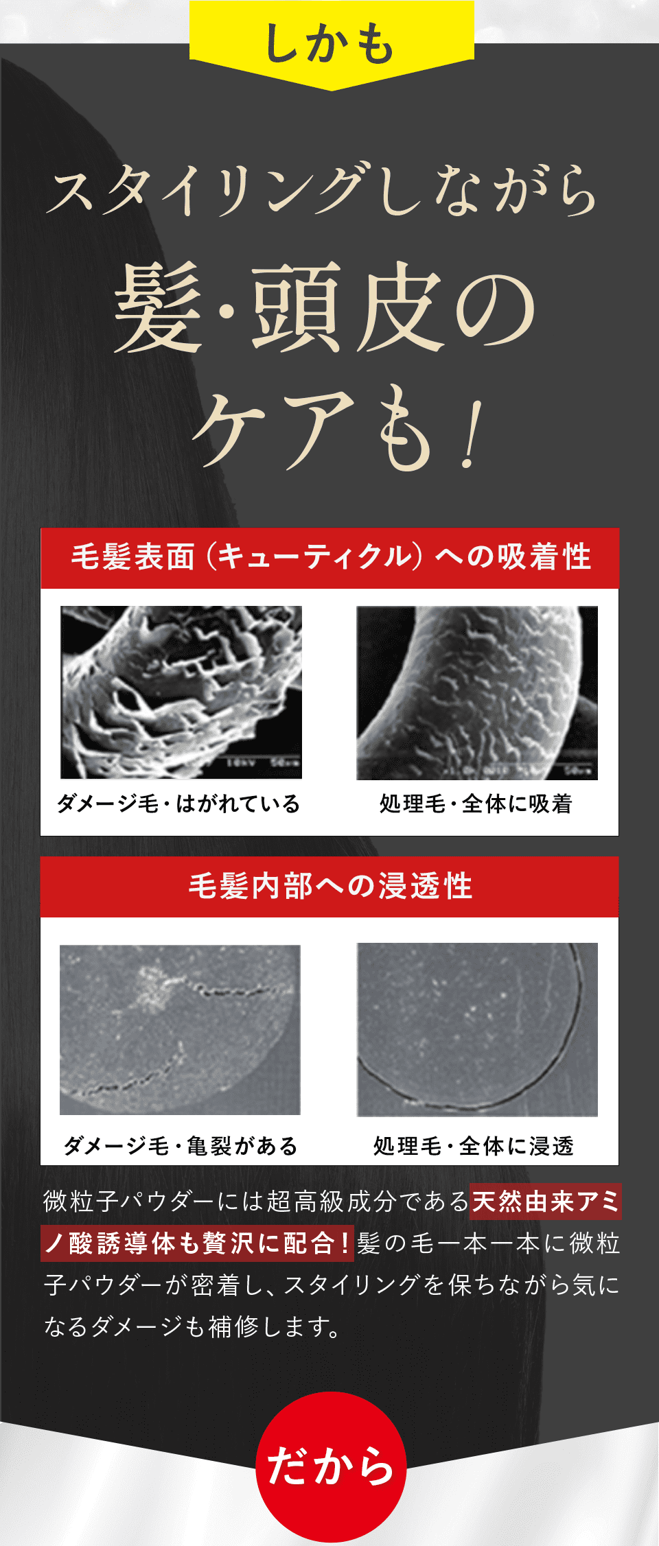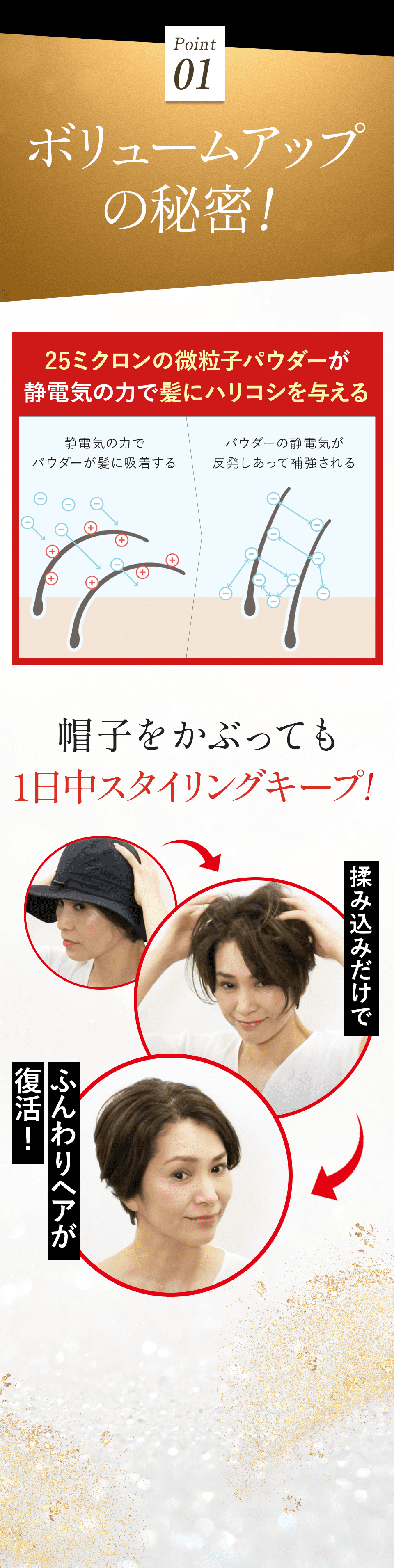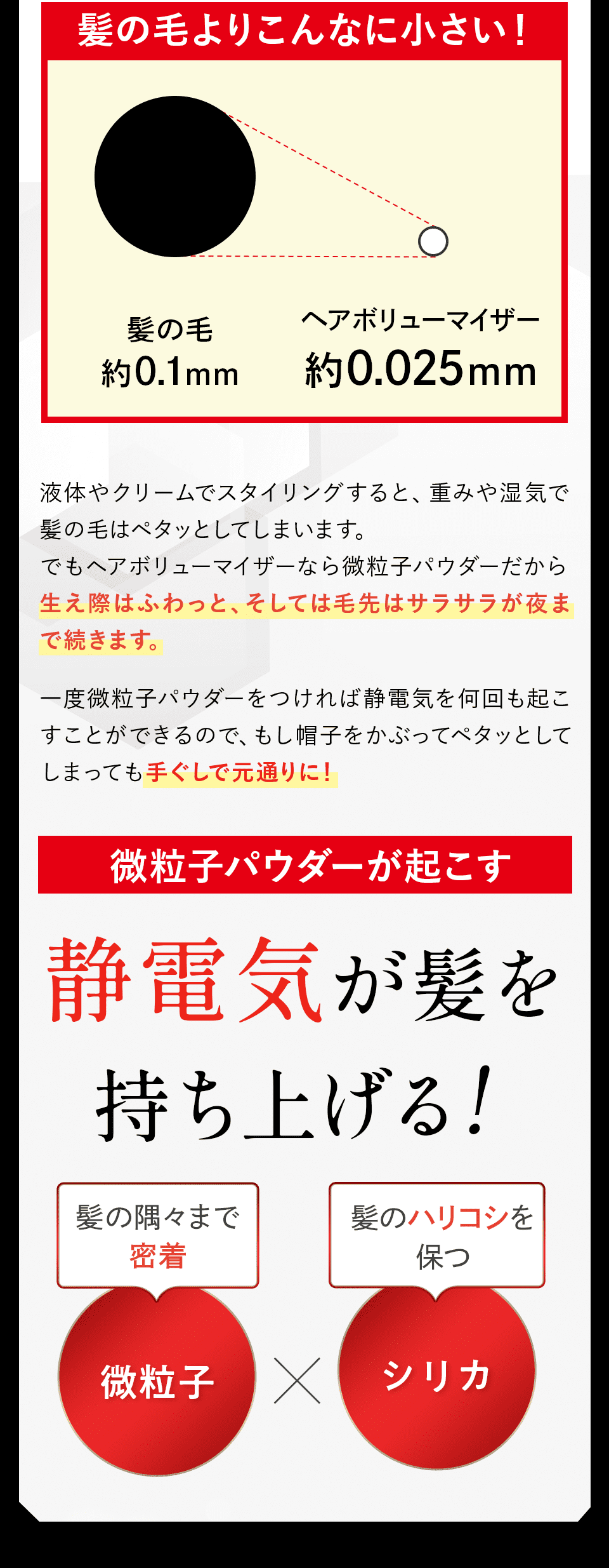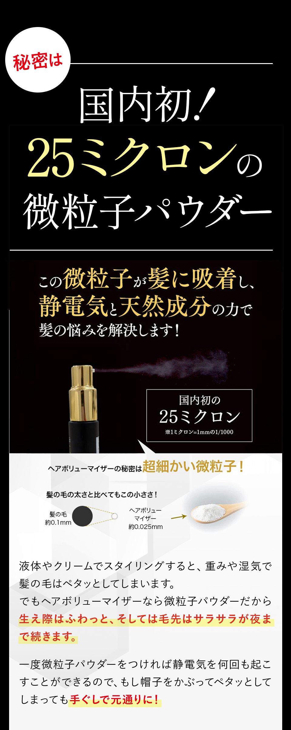 25ミクロンの微粒子パウダーを静電気の力で持ち上げるから、帽子をかぶっても手ぐしで何度でも元どおりにできます。